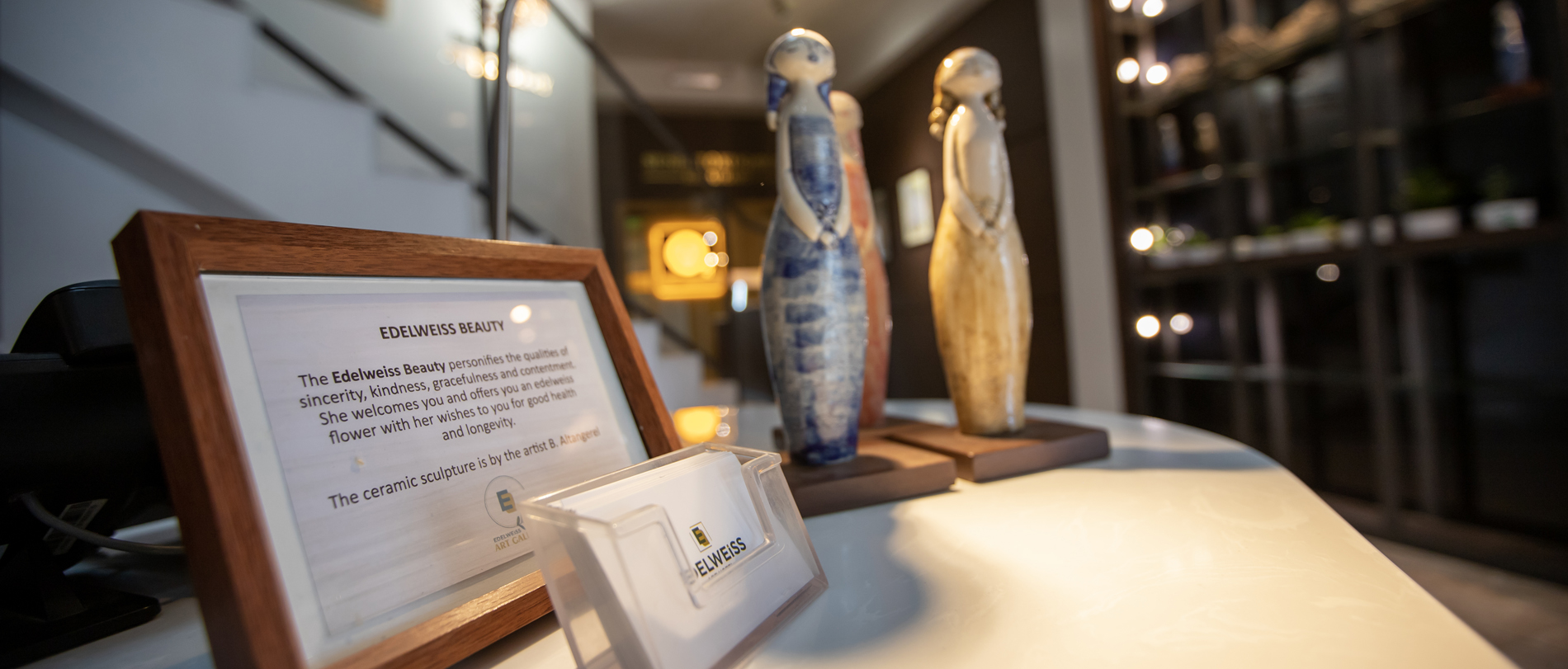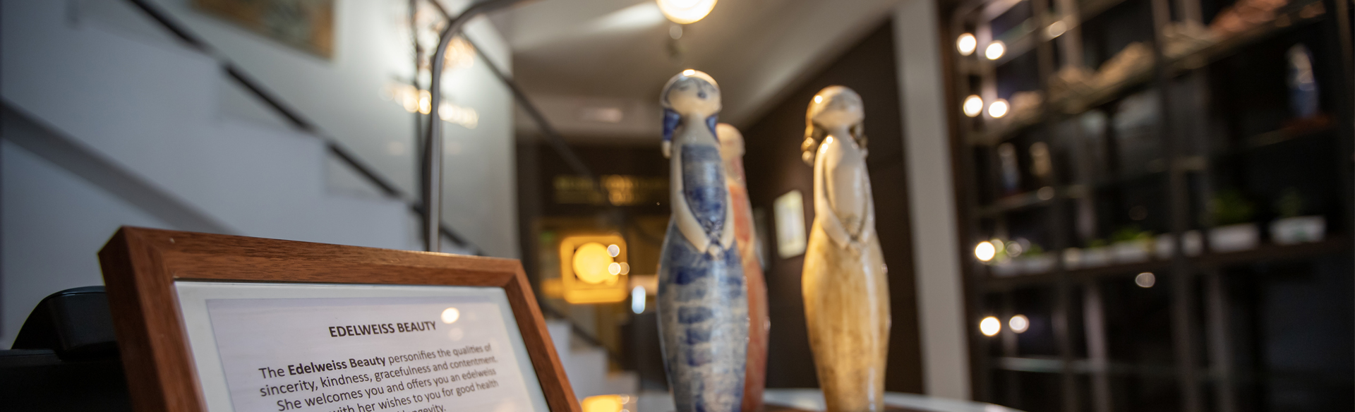 Our service culture is centered on sincerity and kindness, offered to our guests in a simple, friendly manner with our hope for your comfort and contentment. Personified by our own “Edelweiss Beauty”, a series of ceramic figurines placed throughout the hotel, the “beauty” extends an edelweiss flower to all our guests for good health and happiness.